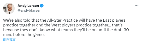 据爵士记者Andy Larsen报道,全明星正赛开打前,东部全明星球员和西部全明星球员是分开训练的,因为今年全明星赛再次改制,正赛开打前30分钟,詹姆斯和字母哥两大队长现场选人组队。