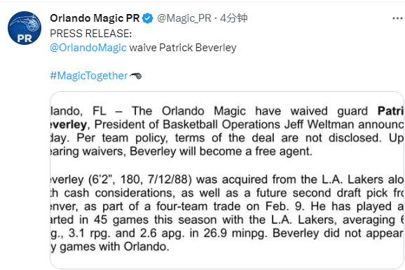 JRS直播网02月13日,魔术官方正式宣布裁掉贝弗利和特伦斯-罗斯,热火、公牛等多支球队有意贝弗利;32岁罗斯计划澄清期后加盟太阳。