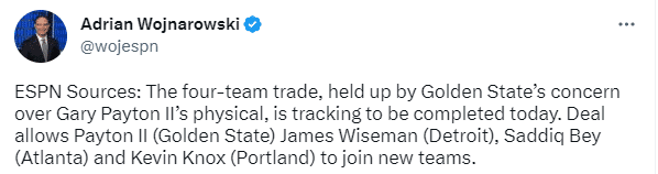 随着勇士同意完成四方交易,怀斯曼正式加盟活塞,改穿13号并且获得首发;小佩顿重返勇士并且改穿8号,重返赛场的时间暂未可知;萨迪克-贝加盟老鹰和诺克斯前往开拓者。