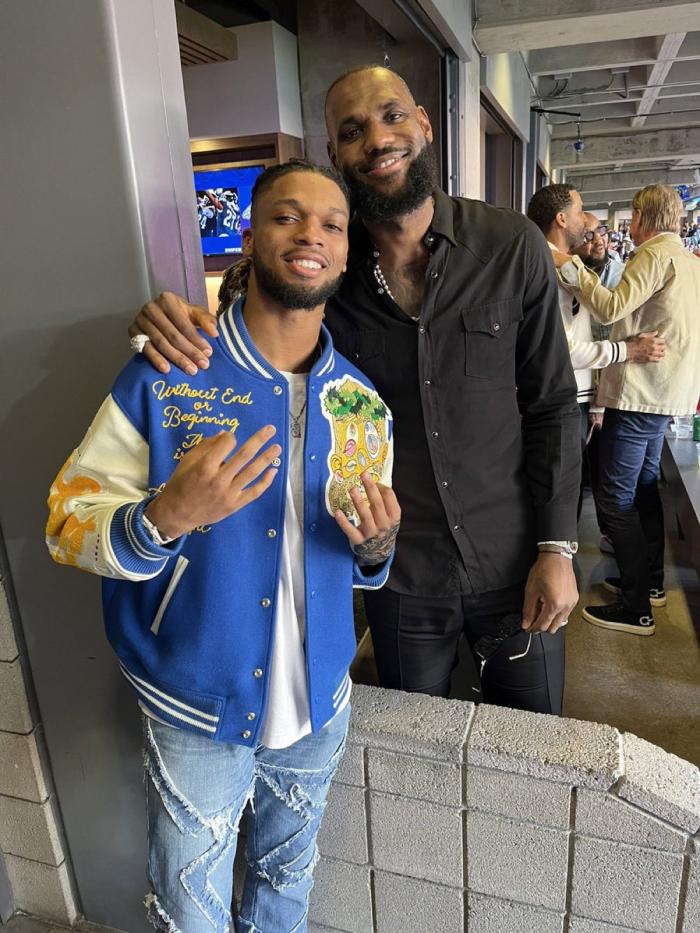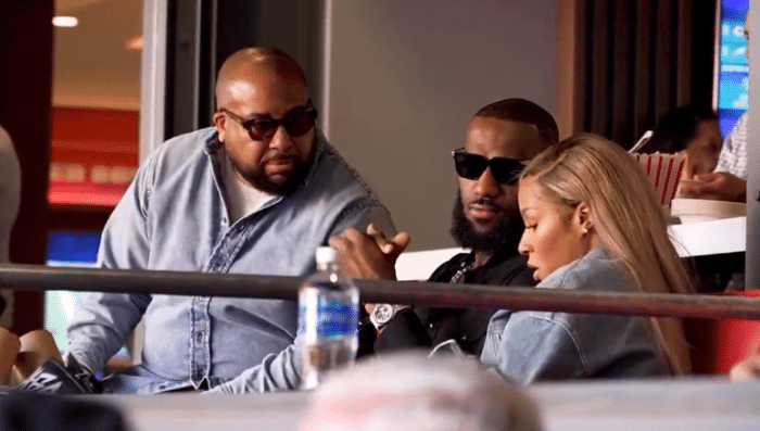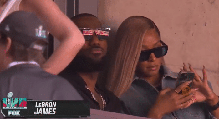 38岁詹姆斯身穿黑色休闲便装、戴着墨镜来到NFL第57届超级碗现场,酋长大战老鹰;詹嫂萨瓦娜也戴着墨镜,之后她摘掉墨镜,和老詹交流闲聊;詹姆斯夫妇坐在VIP包厢中,他们身旁的壮汉是老詹的保镖。