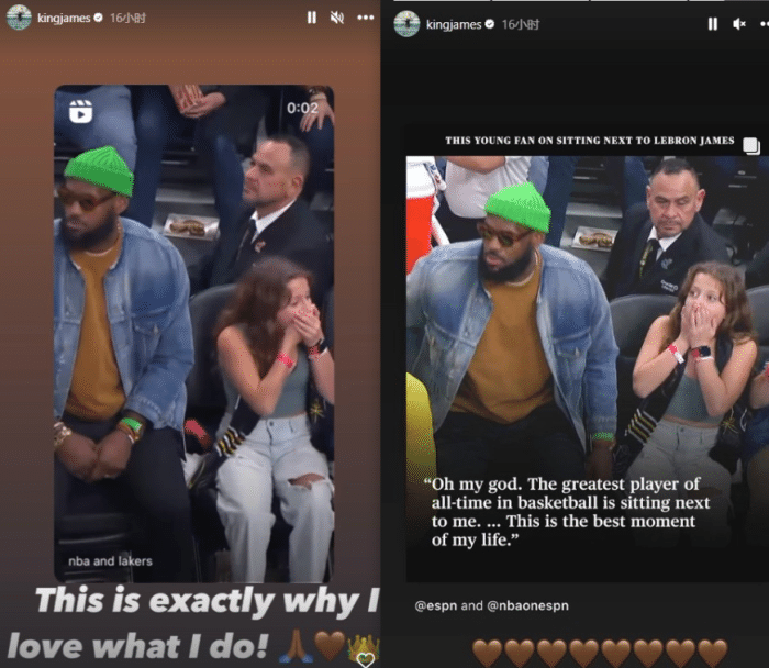 不久前,詹姆斯转发自己落座时12岁小女孩捂嘴吃惊一幕,配文写道:这就是我热爱这份工作的原因;老詹还转发小女孩的采访内容,当时小女孩表示:我的天啊。历史最佳球员就坐在我的身边。这是我生命中的最佳时刻。