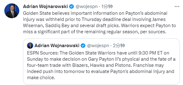 JRS直播网讯02月12日,勇士四方大交易恐流产,据名记woj报道,勇士需要周一上午10点30分前决定是否取消勇士、活塞、老鹰和开拓者的四方交易,勇士将再次检查小佩顿的身体并做出最终决定;勇士认为在交易中,小佩服的腹部伤病被隐瞒了,小佩顿将缺席常规赛的大部分时间。