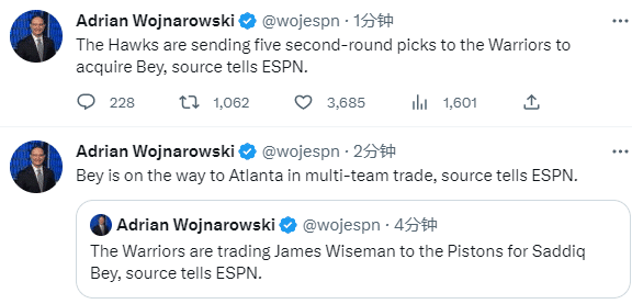 JRS直播网讯02月10日,NBA交易截止日前,勇士、老鹰和活塞达成一笔三方交易,据名记woj报道,勇士把榜眼怀斯曼交易到活塞,从老鹰得到五个次轮签,活塞把萨迪克-贝送到老鹰。