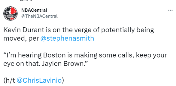 名嘴A-史密斯在节目中表示,杜兰特也可能被交易,他透露:我听说杜兰特也有可能在被交易的边缘了,很显然我们也都有在猜测这件事情。我听说波士顿已经在打电话询问了,我们可以留意一下杰伦-布朗,留意一下他。