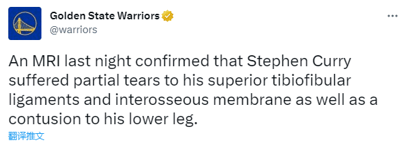 JRS直播网讯02月06日,勇士官方宣布,核磁共振检查结果显示,库里遭遇左胫腓上韧带和骨间膜部分撕裂的伤病,左小腿也有挫伤,名记shams报道预计库里缺席数周,将无缘全明星赛;医学专家表示预计伤停3-6周。