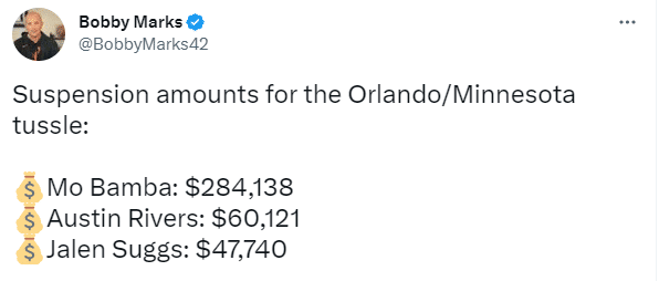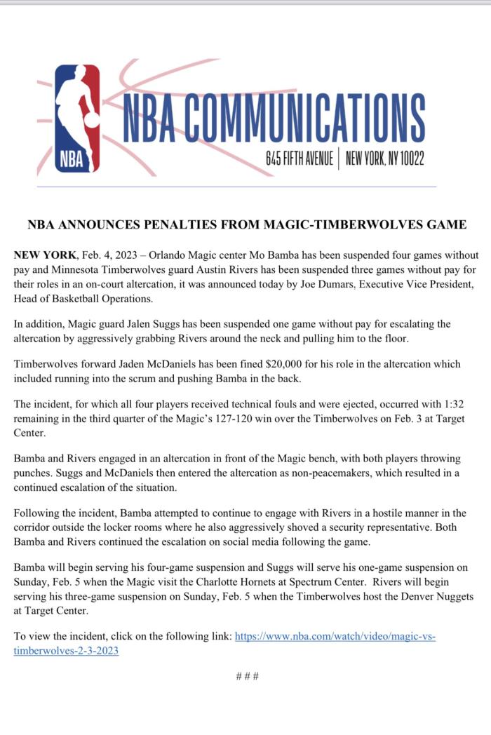 JRS直播网02月05日讯 ,NBA官方公布魔术和森林狼大规模冲突的罚单,班巴停赛4场损失284138美元,小里弗斯停赛3场损失60121美元,萨格斯停赛1场损失47740美元,杰登-麦克丹尼尔斯罚款2万美元。