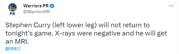 JRS直播网02月05日讯 ,在勇士和独行侠比赛中,勇士球星库里的左腿膝盖不幸受伤,一瘸一拐离场返回更衣室,勇士官宣库里左小腿受伤退赛,X光检查成阴性,明天接受核磁共振检查,医学专家担忧库里膝盖韧带扭伤。