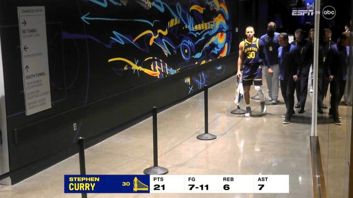 离场前,库里上场25分钟,11投7中、三分6中2、罚球5中5拿到21分7助攻6篮板,本场比赛,库里的状态很好,并且带领球队大比分领先,库里下场后,独行侠反扑追分;库里不幸受伤离场,希望他的伤势无大碍。