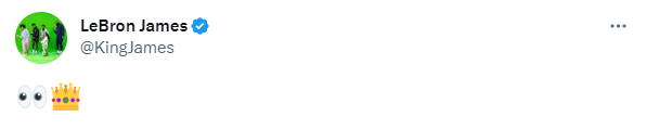 JRS直播网02月04日讯 ,距离交易截止日还剩6天,湖人酝酿大交易,与爵士谈判关于威少的交易;还将与篮网谈判关于欧文的交易;欧文申请离队后,詹姆斯疑似发声回应,晒王冠+眼睛表情,言外之意就是国王看到了。