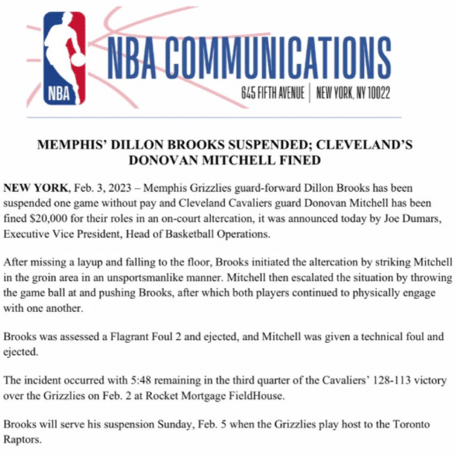 JRS直播网02月04日讯 ,NBA官方公布骑士和灰熊比赛冲突罚单,灰熊悍将狄龙-布鲁克斯被禁赛一场,米切尔被罚款2万美元。