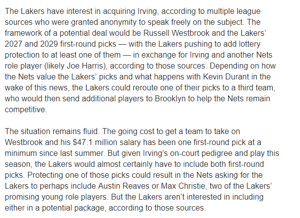 据湖人记者Jovan Buha报道,湖人确实有意引援欧文,威少+两个首轮签换欧文和另一名角色球员(可能是乔-哈里斯)是湖人和篮网潜在的交易框架,而湖人正在推动至少给其中一个选秀权添加乐透保护限制。