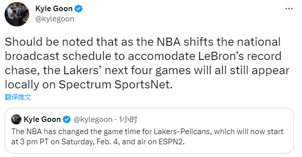 对此,湖人记者KyleGoon发推表示,这是NBA官方为了协调詹姆斯的追逐纪录之旅而做出的转播计划调整。