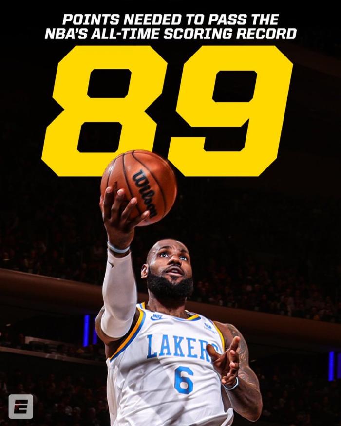 JRS直播网02月02日讯 到目前为止,詹姆斯的常规赛总得分已经达到38299分,距离超越历史第一的贾巴尔仅仅只差89分,或4天后加冕历史得分王,NBA官方就是因此突然更改湖人对阵鹈鹕的比赛时间。