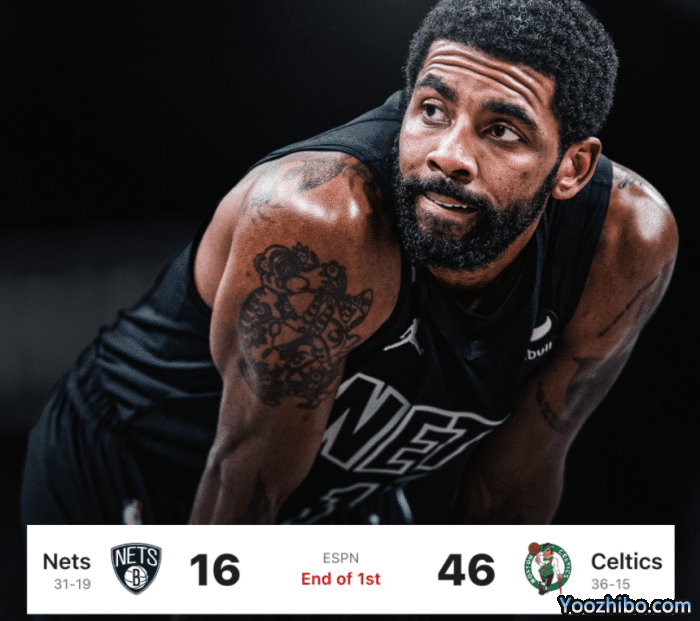 欧文突破为篮网打破僵局,科内特打成2+1,绿军领先到31分,之后欧文下场休息,第一节打完,篮网16-46落后30分。