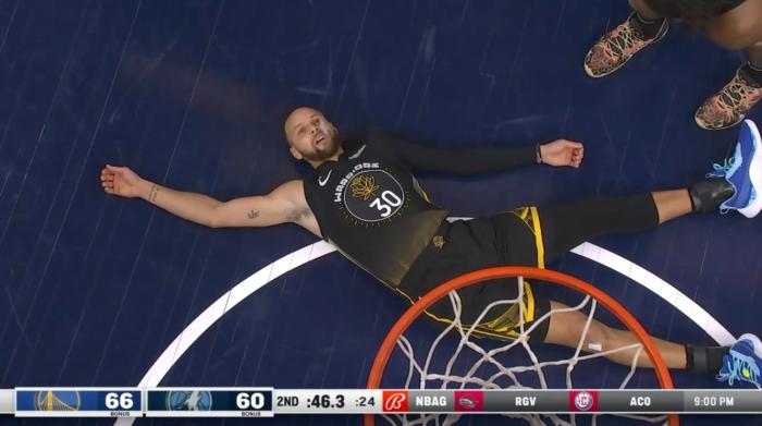 第二节,勇士和森林狼打得十分胶着,库里上场后再次开火,外线再中两记三分,上半场最后时刻,库里强投造犯规,倒地后双臂一摊直接瘫躺在地板上大喘气,库里瘫躺一幕引热议。