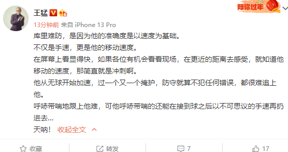 知名篮球人王猛也发文花式盛赞库里,称:“库里难防,是因为他的准确度是以速度为基础。不仅是手速,更是他的移动速度。在屏幕上看显得快,如果各位有机会看看现场,在更近的距离去感受,就知道他移动的速度,那简直就是冲刺啊。他从无球开始加速,过一个又一个掩护,防守就算不犯任何错误,都很难追上他。呼哧带喘地跟上他难,可他呼哧带喘的还能在接到球之后以不可思议的手速再扔进去…天呐!”