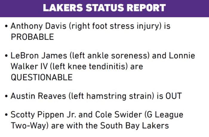 JRS直播网01月28日讯 ,湖人下一场对阵凯尔特人的伤情出炉,詹姆斯(左脚踝酸痛)、朗尼-沃克(左膝伤病)被列为出战成疑,50%可能性出战;浓眉(右脚应激伤病)大概率出战,75%可能性;里夫斯(左腿筋拉伤)、小皮蓬和斯威德缺席比赛。
