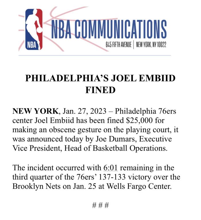 另外恩比德因下流的庆祝动作被罚25000美元,在此前76人战胜篮网的比赛中,恩比德做出了一个大尺度庆祝动作,杜兰特吐槽是垃圾庆祝动作。