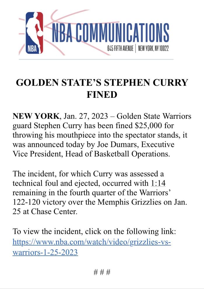 赛后库里对自己的行为表达歉意,不过联盟仍旧追加一笔罚单,库里被罚2.5万美元。本赛季库里年薪是4807万美元,高居联盟第一,场均拿到29.3分6.2篮板6.2助攻,再次成为全明星首发成员。