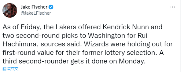 名记Jake Fischer揭秘交易内幕,湖人向奇才报价纳恩和两个次轮,奇才坚持一个首轮,今天湖人加价给出了第三个次轮,最终双方成交。