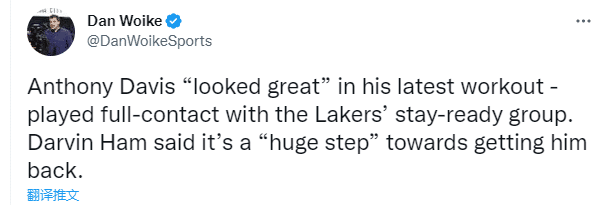 对于浓眉的回归情况,哈姆表示:戴维斯在最近的训练中看起来很棒,他与替补小队进行了全面对抗式训练,这是他康复过程中的一大步。