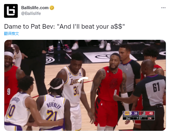 第二节7分37秒,利拉德执行罚球时和贝弗利发生口角,据美媒报道,当时利拉德对贝弗利放狠话:我会狠踹你的屁股,贝弗利不满回嘴并且吃到技术犯规。