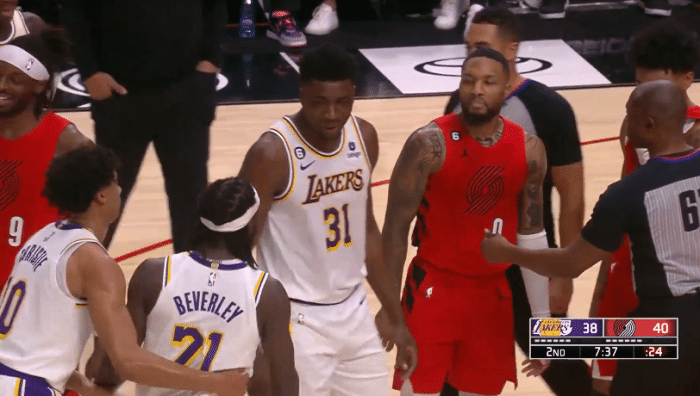 JRS直播网01月23日讯 ,湖人客场25分逆转开拓者,比赛期间,利拉德和贝弗利发生口角争吵,两人争吵内容曝光,利拉德冲着贝弗利放狠话:我会狠踹你的屁股;最后比赛失去悬念时,贝弗利嘲讽利拉德表坏了,并且假装把表塞进裤裆里。