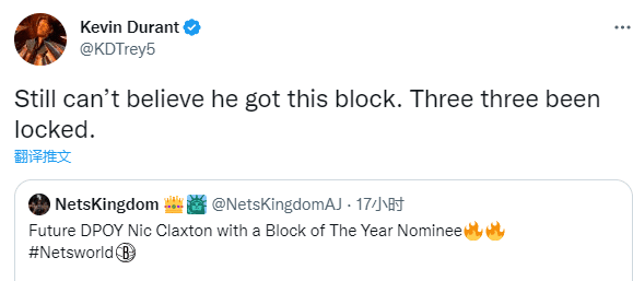 杜兰特夸赞克拉克斯顿,转发赵四空中换手大帽塞克斯顿的精彩一幕,发推写道:仍然无法相信他完成了这记盖帽。33号太猛了。