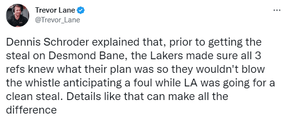 JRS直播网01月22日讯 ,此前湖人险胜并且终结灰熊队的11连胜,施罗德关键时刻抢断并且打成2+1准绝杀,据施罗德透露,湖人执行关键时刻的战术时提前告知裁判他们的计划是先夹击而不是直接犯规。