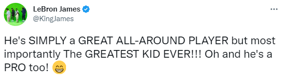 JRS直播网01月20日讯 ,詹姆斯在社媒媒体上转发布朗尼的比赛集锦,发文狂赞自己的大儿子,发推写道:他确实是一名伟大的全能球员,但最重要的是,他是有史以来最伟大的孩子!!!哦,他也是一名职业选手!