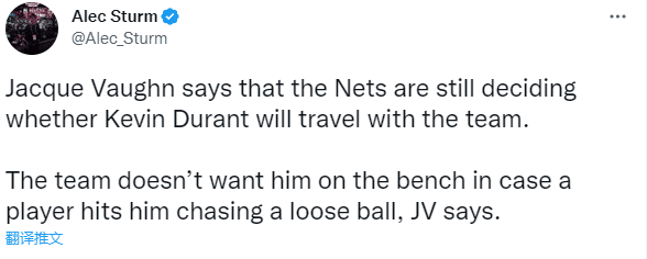 自从杜兰特遭遇右膝韧带扭伤后,他还未公开露面,一直在家中养伤;篮网即将迎来五连客,杜兰特会随队出征吗?沃恩表示球队还没决定是否在下周开启的五连客之旅中让杜兰特随队出征:我们不想让他坐在替补席上,以防有球员在争球或者救球时撞到他。