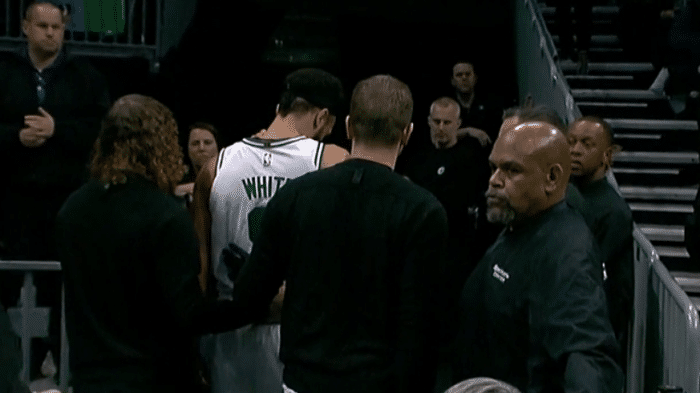 凯尔特人对阵黄蜂第一节,怀特坏冲过来的斯玛特撞到头部,之后怀特捂着颈部十分痛苦,并且倒地不起,塔图姆、斯玛特和霍福德都站在他的身旁,十分担忧队友的伤势;怀特返回更衣室接受检查,最终因颈部扭伤而提前退赛。
