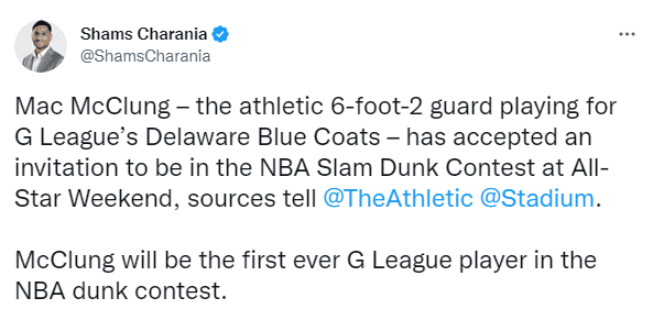 JRS直播网01月14日讯 ,据名记shams报道,湖人旧将马克-麦克朗已经接受参加NBA扣篮大赛,麦克朗承诺参加扣篮大赛创造历史,成为史上第一位参加扣篮大赛的发展联盟球员;目前扣篮大赛4人名单已确定三席,另外两位参赛者是开拓者新秀夏普和火箭名宿之子小马丁。
