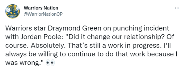 再次谈到内讧事件,格林表示:那次冲突改变了我们之间的关系吗?当然,绝对的。这仍在进行中。我一直很愿意尝试修复我们之间的关系,因为是我错了。