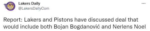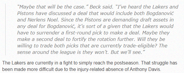Howard Beck透露:我听说湖人和活塞讨论了一笔包括博扬和诺埃尔的交易。由于活塞对交易博扬有选秀权的要求,所以湖人必须交出一个首轮签才能达成交易。或许他们会达成另一笔交易,进一步加强轮换。就目前的市场而言,湖人愿意付出两个首轮签吗?联盟的感觉是不会,我们再看看吧。