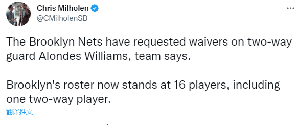 JRS直播网01月13日讯 ,篮网官方宣布,球队正式裁掉双向合同球员阿隆德斯-威廉姆斯,腾出一个阵容名额,这可能意味着篮网正在酝酿交易从而引援补强;篮网大战绿军,火速召回夏普和爱德华兹两大潜力新星。