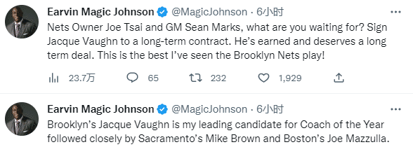 JRS直播网01月12日讯 ,湖人名宿魔术师约翰逊发推谈到篮网现状,表示篮网是凯尔特人进入总决赛的最大威胁,盛赞欧文并且呼吁篮网赶紧续约主帅沃恩。