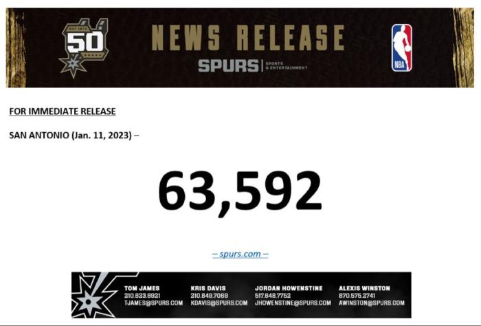 JRS直播网01月12日讯 ,本赛季马刺战绩糟糕,但马刺已经打破一项NBA历史第一纪录,据报道,马刺迎着勇士的门票已经售出63592张,打破NBA历史上座纪录。