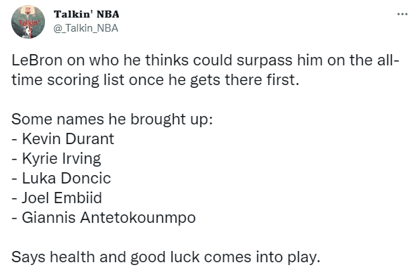 接受专访时,詹姆斯谈到自己加冕历史得分王后,谁能超越他?老詹提到了几个名字,提到了杜兰特、欧文、东契奇、恩比德和字母哥,还表示健康和运气会起到很大的作用。