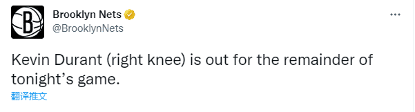 在篮下,杜兰特被倒地的巴特勒不慎撞倒膝盖,杜兰特穿上鞋之后继续比赛,之后杜兰特要求下场,并且返回更衣室接受检查;之后篮网官宣杜兰特因右膝受伤退出本场比赛。