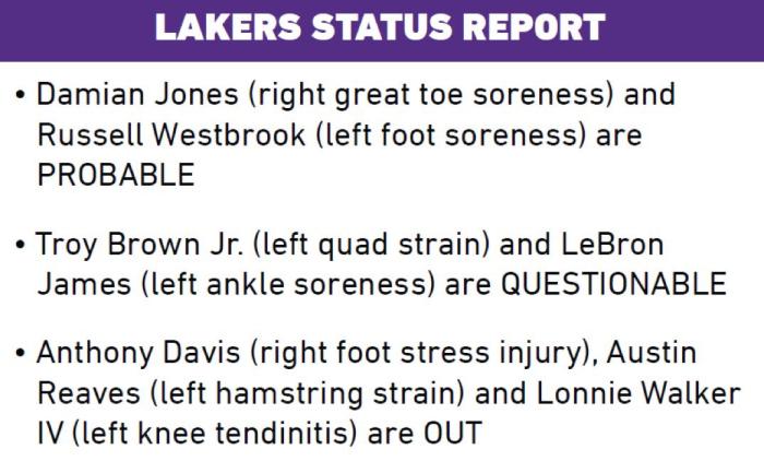 JRS直播网01月08日讯 ,湖人官宣客场背靠背对阵国王的伤病报告,詹姆斯(左脚踝酸痛)和特洛伊-布朗(左四头肌拉伤)被列为出战成疑,50%可能性;达米安-琼斯(左脚趾酸痛)和威少(左脚酸痛)被列为大概率出战,75%可能性;浓眉(右脚应力损伤)、里夫斯(左腿筋拉伤)和朗尼-沃克(左膝肌腱炎)都因伤继续缺席比赛。