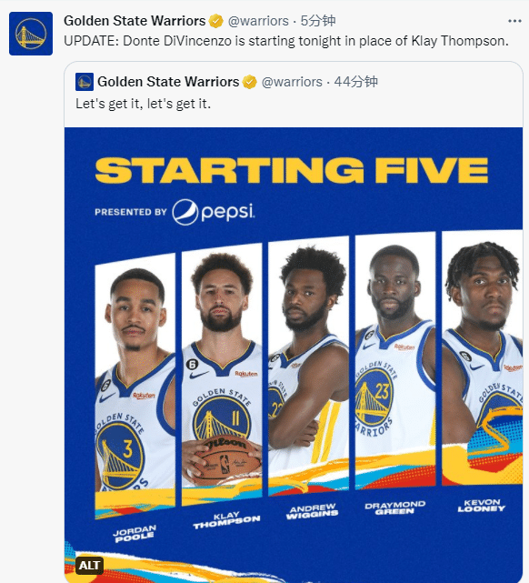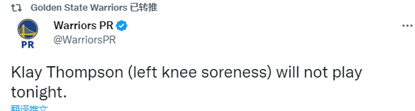 赛前勇士早早确定首发五虎,维金斯复出,汤普森也在首发阵容中,可就在比赛开打之前,勇士官方宣布迪温琴佐顶替克莱首发出战;汤普森突然退出比赛,并且不在勇士替补席,勇士官方暂未透露克莱退出首发的理由,之后勇士官宣克莱因左膝酸痛退出比赛。