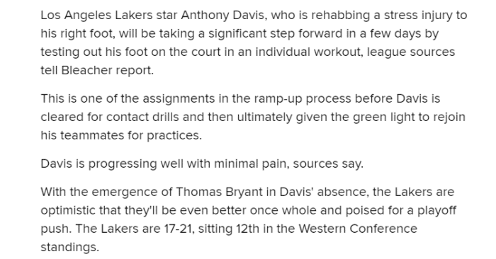 JRS直播网01月07日讯 ,据BR名记ChrisHaynes报道,浓眉的伤势恢复顺利,未来几天将进行个人训练,短期内湖人希望他能参加队内对抗训练,一旦浓眉复出,湖人将全力争夺季后赛。