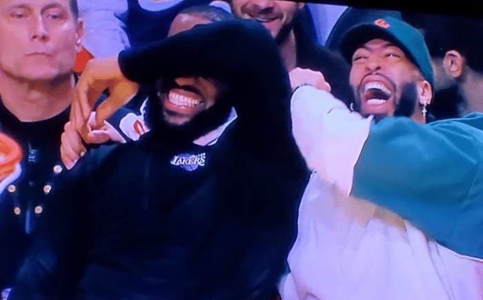 詹姆斯和浓眉咧嘴大笑一幕曝光,末节湖人双巨坐在替补席,都笑得前仰后仰,早已合不拢嘴,他们真的太开心了。