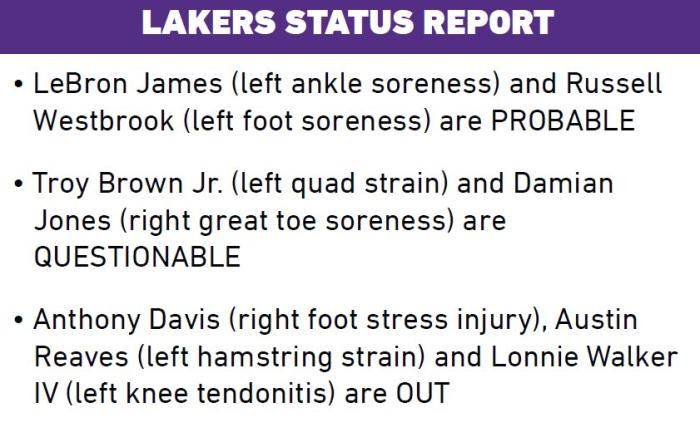 JRS直播网01月06日讯 ,湖人官方正式公布下一场对阵老鹰的伤病报告,詹姆斯(左脚踝酸痛)和威少(左脚酸痛)大概率出战;特洛伊-布朗(左四头肌拉伤)和达米恩-琼斯(右脚趾酸痛)出战成疑;浓眉(右脚伤病)和里夫斯(左腿筋拉伤)和沃克(左膝肌腱炎)缺席;上一场90度崴脚的施罗德伤势无碍,不在伤病名单上。
