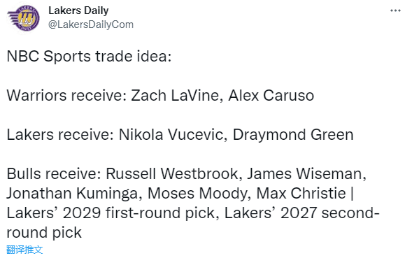 JRS直播网01月05日讯 ,针对目前各支球队的情况,美媒NBC列出一笔湖人、勇士和公牛三方交易方案:拉文、卡鲁索联手库里,湖人获武切维奇、追梦格林两大冲冠帮手,公牛则获得重建筹码。
