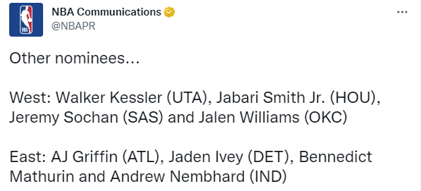 JRS直播网01月04日讯 ,NBA官方正式公布12月东西部各项月最佳奖项,恩比德和东契奇夺得东西部月最佳球员,国王4号秀默里和魔术状元班凯罗夺得月最佳新秀。
