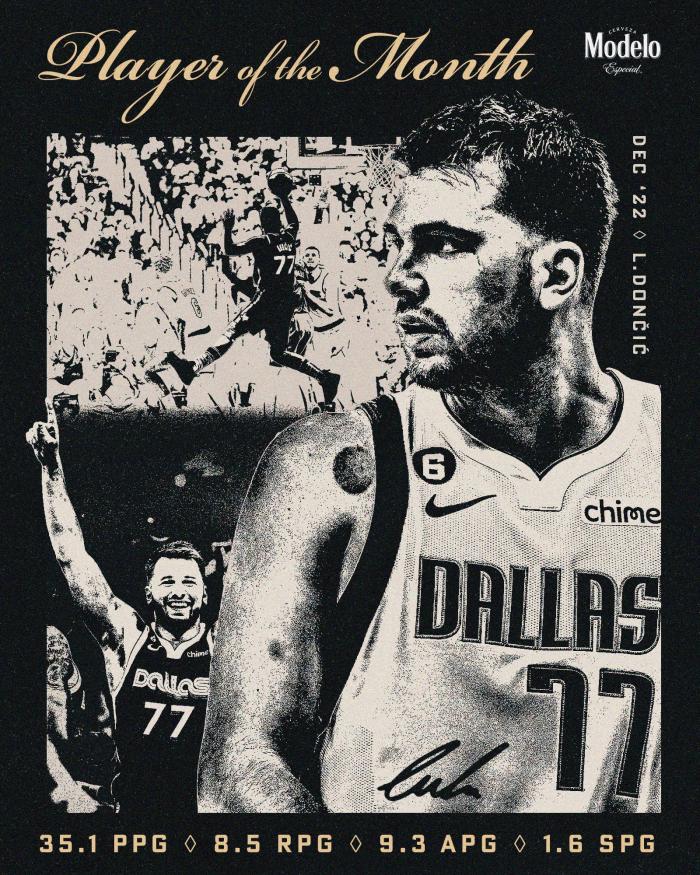 在12月份,东契奇出战15场比赛,场均轰下35.1分8.5篮板9.3助攻1.6抢断,投篮命中率51.9%,三分命中率42.4%以及罚球命中率75.2%,出战时带队拿到11胜4负,单月轰下526分128篮板139助攻比肩乔丹、威少和罗伯特森成历史第4位单月至少500分125篮板125助攻的球员;过去5场比赛,东契奇3次单场狂砍50+,击败尼克斯更是狂砍60分21篮板10助攻的历史第一三双。