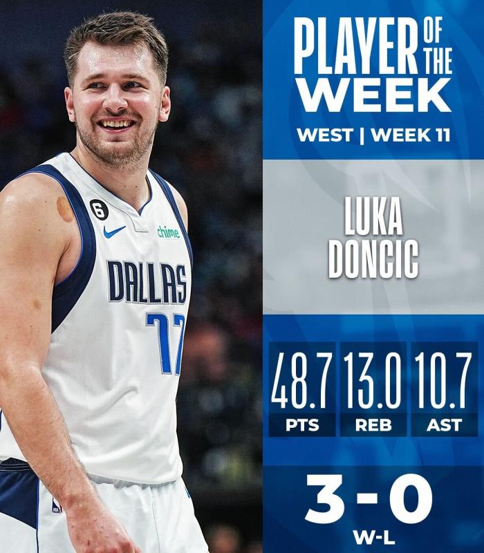 东契奇连续2周夺得周最佳,生涯第9次当选,独行侠官方第一时间祝贺卢卡。