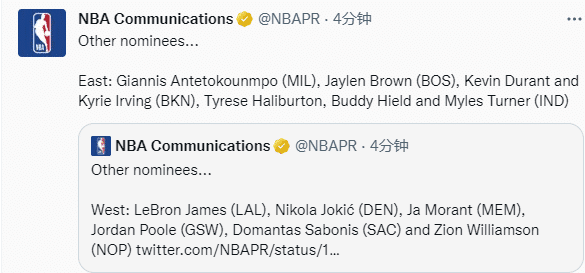 JRS直播网01月03日讯 ,NBA官宣最新一周东西部周最佳球员,东契奇场均48+三双再次当选,波尔津吉斯也上榜,詹姆斯、杜兰特和欧文等球星获提名。